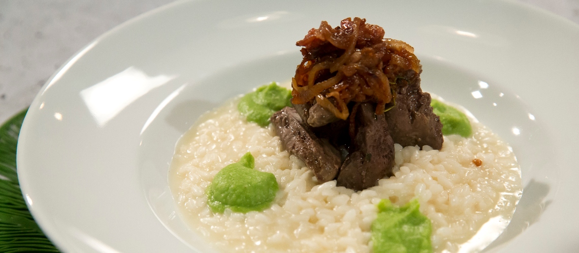 Külön edényben hagymát dinsztelünk majd beletesszük a rizst. Átkeverjük, ezután fokozatosan adagolva az alaplevet és a fehérbort közepesen keményre készítjük a rizottót. Amikor elértük a kívánt puhaságot, hideg vajat és parmezant keverünk bele.