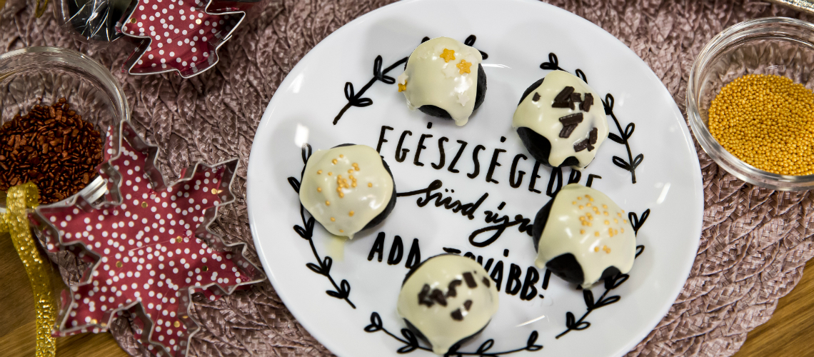 Amikor már folyik, vegyük le a gőzről, és keverjük el benne a maradék 1/3-ot. Ez a harmadolás azért kell, mert így temperáljuk a csokit, és szépen fog megdermedni, nem lesz foltos, nem fog kicsapódni rajta a kakaóvaj. A golyókat kivesszük a hűtőből, és egy kiskanál segítségével fehércsokit csurgatunk a tetejükre, ami majd szépen lefolyik rajtuk.