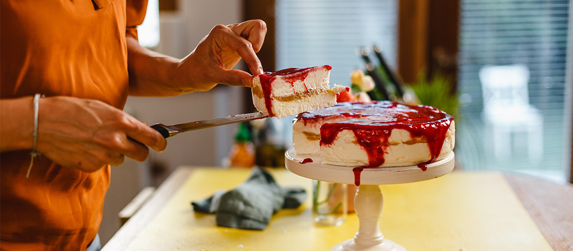 Tálalás előtt 20 perccel vegyük ki és utána a formából kiborítva szeleteljük. A ribizliszósszal tálaljuk. Forró késsel szeleteljük.