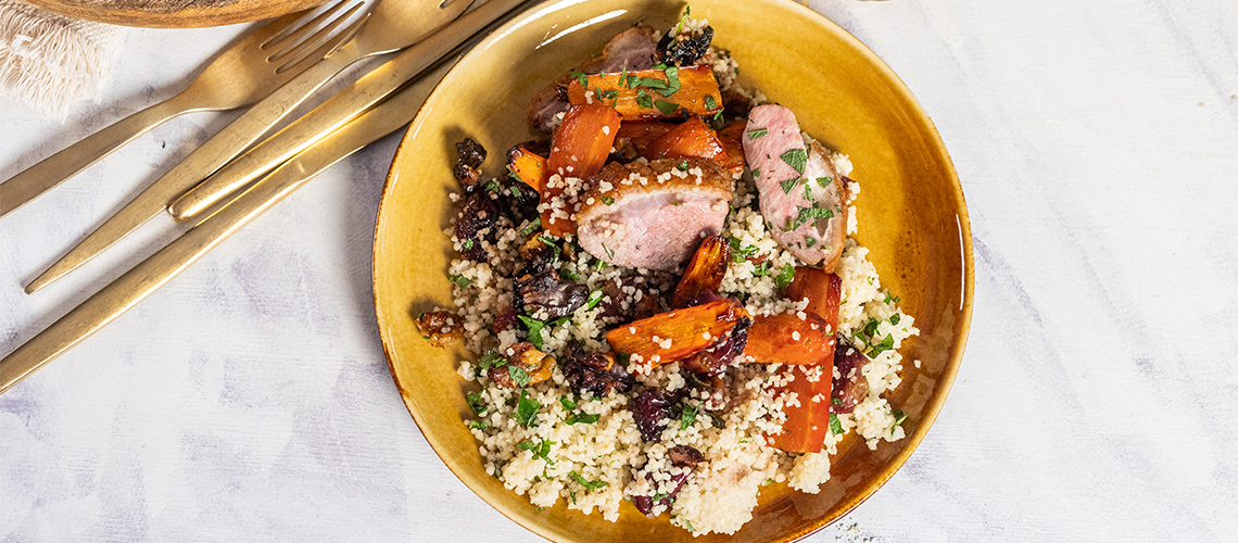 A kuszkuszt főzzük készre, keverjük össze a sült sárgarépával, szőlővel, pirított dióval és a finomra aprított zöldfűszerekkel.