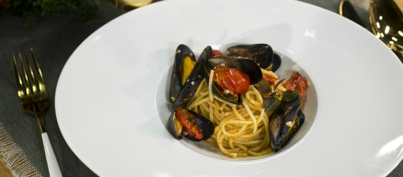 A petrezselymet és a fokhagymát apróra vágjuk. Egy lábosba olíva olajat teszünk, majd hozzáadjuk az apróra vágott petrezselymet és fokhagymát, pár percig pároljuk. Beletesszük a kagylókat, sózzuk, borsózzuk, fehér bort adunk hozzá, egy merőkanálnyi forró vizet adunk hozzá. A cherry paradicsomokat félbe vágjuk, sózzuk, a levét 10 percig csöpögtetjük és felfogjuk egy edénybe. Az így nyert levet ráöntjük a kagylókra. Kivesszük a kagylókat a lábosból. A paradicsomot magas hőfokon főzzük, várjunk, amíg megpuhul. Kivesszük a paradicsomokat és a kagylóhoz adjuk. Megfőzzük a spagettit, félkeményre hagyjuk, majd a kagylós szószban tovább főzzük, majd a kagylók levét is hozzáadjuk. Tálalunk.