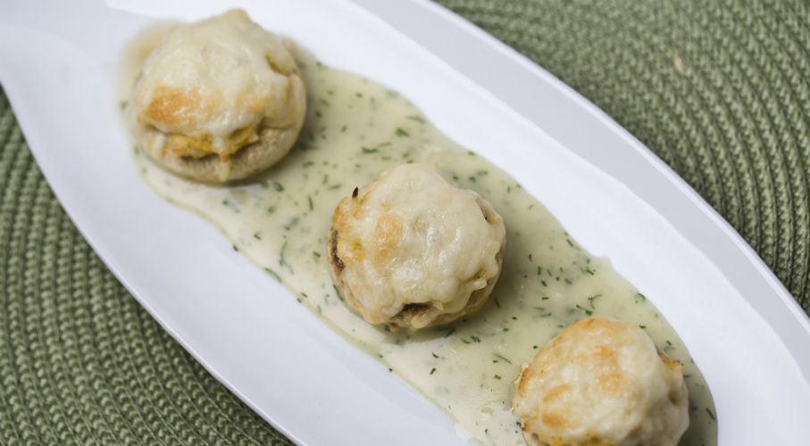 A főtt karalábéból golyókat vájunk, félretesszük és a maradékot pedig apróra vágjuk, vagy lereszeljük. Összeforgatjuk kevés főtt rizzsel, finomra vágott, pirított vöröshagymával. Sózzuk, borsozzuk és hozzáadunk 1 db tojást. Enyhén ecetes sós vízben forrázott gombafejekbe töltjük, majd reszelt sajttal a tetején besütjük Vajban lisztet pirítunk, felengedjük húsalaplével, sózzuk, borsozzuk, majd friss kaporral illatosítjuk a mártást, amivel tálaljuk a töltött gombát.