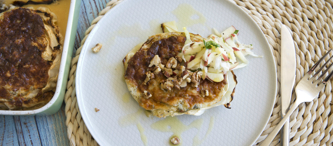 Kéksajtos sült káposzta pörkölt csonthéjasokkal