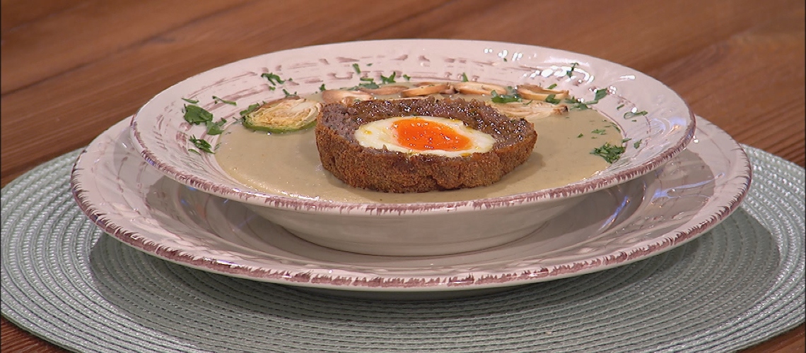 A darált húst egy tálban összekeverjük sóval, borssal, az apróra vágott zöldfűszerekkel, a zúzott fokhagymákkal, és a mustárral. Alaposan összedolgozzuk. A húst 4 egyenlő gombócra osztjuk, kilapítjuk őket, és egyesével beburkoljuk vele a tojásokat úgy, hogy mindenhol befedje azokat.