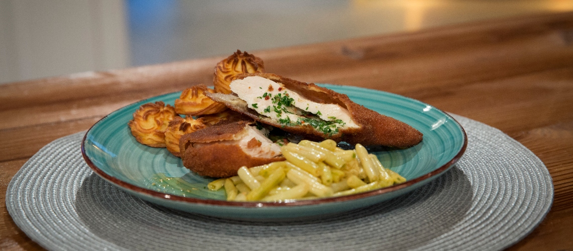 A csirkemellekbe óvatosan zsebet vágunk, hogy ne vágjuk át a végeit. Sózzuk, borsozzuk, beleteszünk a megszilárdult fűszervajból egy-egy darabot. A szokásos módon lisztbe, tojásba és zsemlemorzsába panírozzuk duplán. Bő, forró, de nem túl forró olajban (170 fok) kb. 5-8 perc alatt kirántjuk, majd fogyasztás előtt hagyjuk hűlni pár percig.