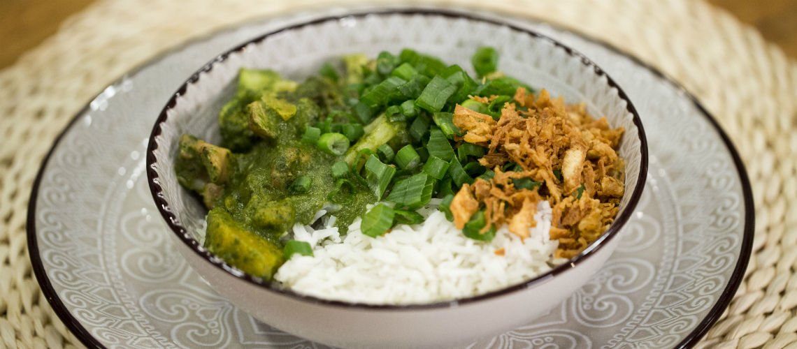 az olajon üvegesre dinszteljük a felkarikázott újhagymát, a fokhagymát, a gyömbért, a chilit. Hozzáöntjük a kókusztejet, összeforraljuk, majd hozzáadjuk a felolvasztott spenótpürét. 10 percig főzzük. Beletesszük a megsütött csirkét és zöldségeket, és összerottyantjuk a szósszal. Amikor elkészült, egy kevés zöldcitromlével és egy csipet nádcukorral ízesítjük, végül felkarikázott újhagymával és korianderrel megszórva, párolt jázminrizzsel tálaljuk.