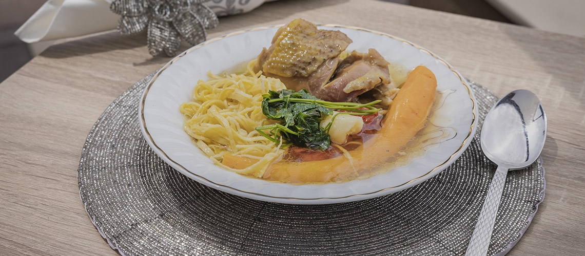 A marhahúst kissé előfőzzük, lehabozzuk, előkészítjük a főzésre. Egy nagy lábasban vizet forralunk, beletesszük a marhahúst, majd mikor már kiengedte a zsírját, beletesszük a tyúkot is. Ezt követik a zöldségek. Sózzuk, a krumplit csak később tesszük bele. A levest nagyon lassú tűzön készre főzzük.