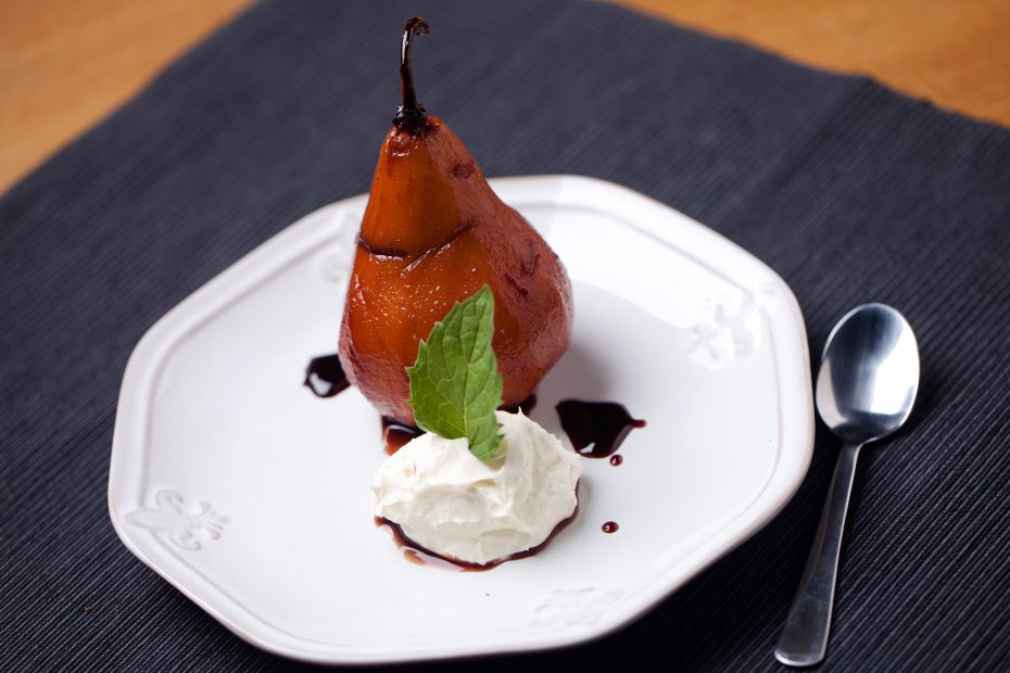 A körtéket meghámozzuk, és óvatosan eltávolítjuk a magházukat. (de hagyjuk egészben) Citromlével meglocsoljuk, hogy ne barnuljanak be. Egy kislábosba öntjük a bort. Hozzáadjuk a fűszereket, a cukrot és egy kevéske reszelt citromhéjat. A körtéket kis lángon 8 percig főzzük. A főzőlevet sziruppá redukáljuk. A redukcióval meglocsoljuk a körtéket. Joghurttal tálaljuk.