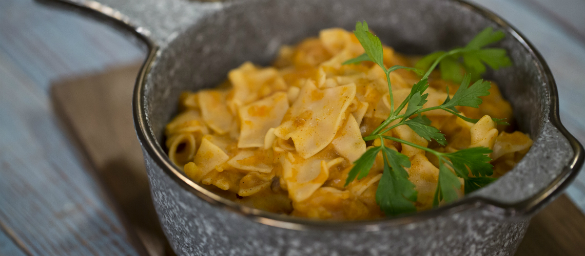Szaftosra hagyva összetöröm a burgonyát és úgy keverem hozzá a külön, sós vízben főzött tésztát. Serpenyőben megpirítva, borssal alaposan megszórva tálalom.