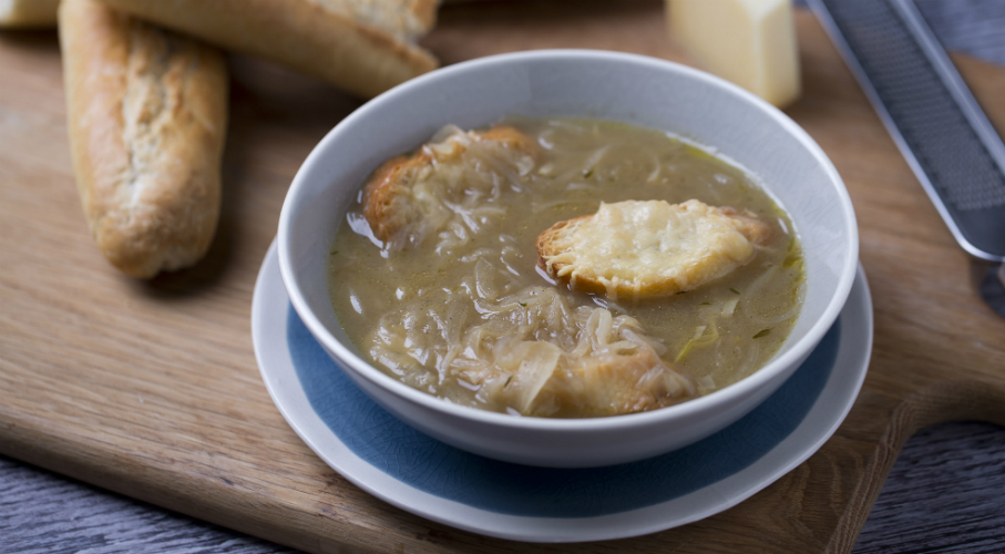 A felolvasztott vajban a vékonyra szeletelt vöröshagymát egyenletesen barnára pároljuk. Kevés barnacukorral megszórjuk. Hozzáadjuk a szeletelt fokhagymát, kevés lisztet adunk hozzá. Néhány perc keverés után felöntjük az alaplével és a borral. Ekkor fűszerezzük a babérlevéllel, kakukkfűvel és a szerecsendióval. Sózzuk. 25-30 percig főzzük. Tálaláskor a reszelt sajtot a baguettre tesszük, ráolvasztjuk és erre merjük a levest.