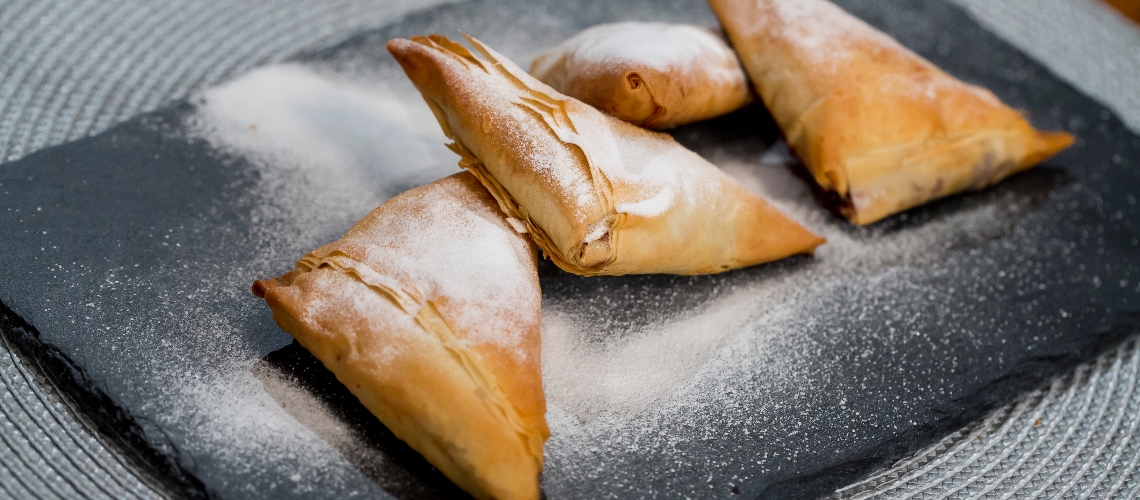 A réteslapokat megkenjük az olvasztott vajjal. Hármasával egymásra tesszük a vajjal megkent lapokat és mindegyiket 3 hosszú csíkra felvágjuk, tehát összesen 9 adagot készítünk el. A csíkok végére kanalazunk a töltelékből és háromszög alakban felhajtogatjuk a tésztát. Minden oldalát megkenjük olvasztott vajjal, majd sütőpapírral leterített tepsire tesszük és 180 fokra előmelegített sütőben 30 perc alatt ropogósra sütjük a réteseket.