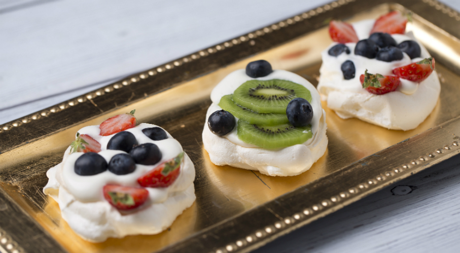 A fehérjét felverjük, és közben fokozatosan adagoljuk a cukrot és a keményítőt. A legvégén adjuk hozzá az ecetet. 150 fokos sütőben sütjük 30 percig, majd nyitott ajtónál pihentetjük a lekapcsolt sütőben további 30 percig. A tetejére felvert tejszínhabot teszünk és friss gyümölcsöket. (kiwi, eper, pirosbogyós)