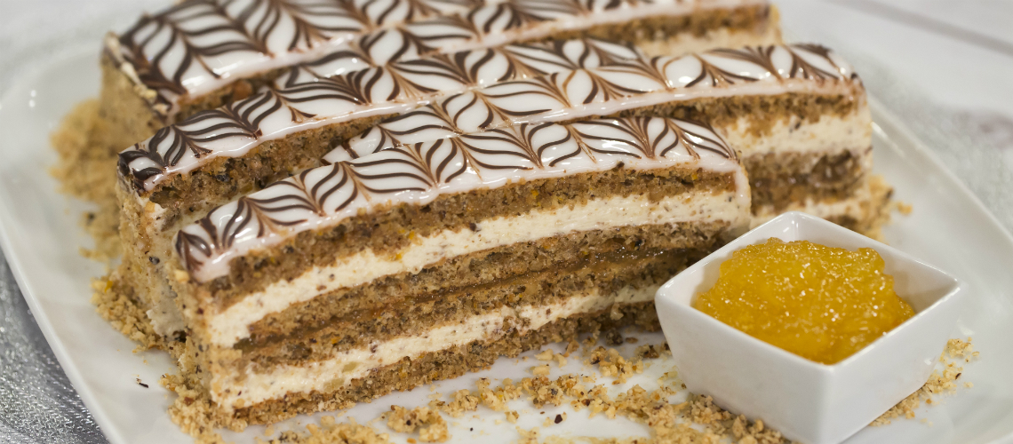 A kihűlt lapot 4 részre vágjuk, egymásra tesszük, leszélezzük, hogy ugyanakkorák legyenek. Alulra és felülre a diós főzött krémet kenjük, középre pedig jó minőségű narancslekvárt.
