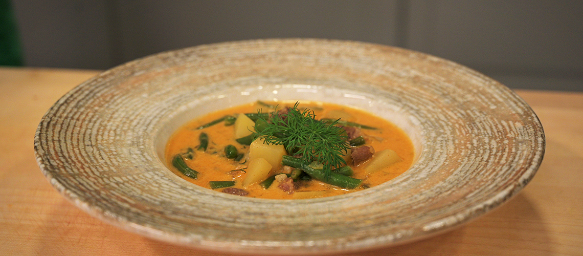 A finomra vágott vöröshagymát, fokhagymát, paprikát, paradicsomot zsírban megpirítjuk. Tűzről lehúzva szórjuk fűszerpaprikával, és felöntjük kevés alaplével. Többször szakaszosan visszapároljuk. Ezután belehelyezzük a kisebb kockára vágott húst, majd fűszerezzük borssal, köménnyel, babérlevéllel, illetve sózzuk. Amikor a hús, jó félig megpuhult hozzáadjuk a a burgonyát is. Természetesen az elforralt folyadékmennyiséget folyamatosan pótoljuk. Legvégén tesszük bele a fagyasztott zöldbabot, majd kevés lisztet tejföllel elkeverve, hőkiegyenlítéssel behabarjuk. Amennyiben szükséges utána ízesítjük, és a végén friss vágott kaporral illatosítjuk.
