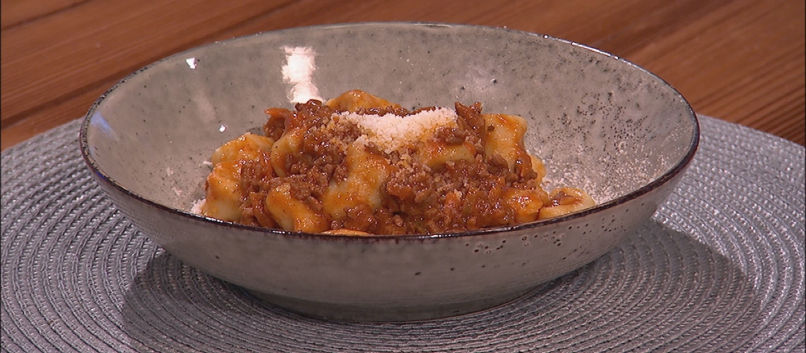 A gnocchihoz a krumplit héjában megfőzzük, ha megfőtt lehúzzuk a héját, és a krumplit egy tálban összetörjük.