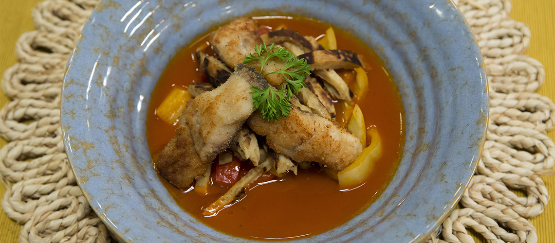 Szeletelt vöröshagymát olajban megpirítunk, rátesszük a paradicsompürét és a darabolt paradicsomot. Sózzuk, fűszerezzük borssal, kakukkfűvel. Felengedjük fehérborral, vízzel és hozzáadjuk a halcsontokat. Sűrű mártást főzünk belőle. Sós, borsos palacsintatésztát készítünk, amelybe reszelt, karamellizált cukron pirított káposztát keverünk. Vastagabb tésztákat sütünk, amiket tálalás előtt felcsíkozunk. A sózott, irdalt pontyfiléket zsemlemorzsába forgatva ropogósra sütjük és a leszűrt mártásba halmozott tésztára helyezzük.