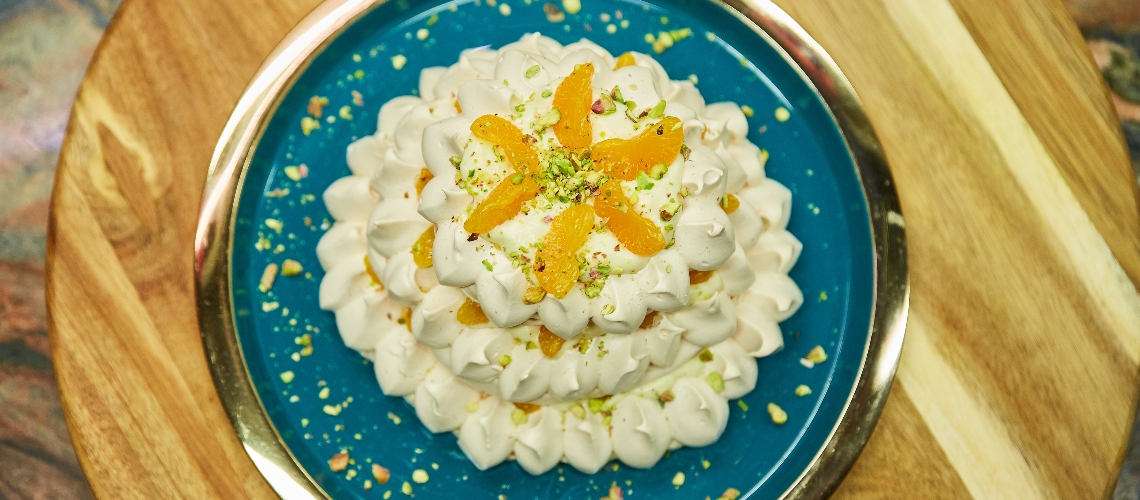 Pavlova torta fehércsokoládés mascarpone krémmel és mandarinnal