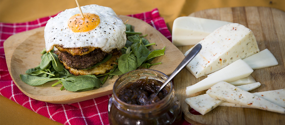 Az első görhönylapra helyezzünk spenót levelet, a levelekre helyezzük a kisült marhahús pogácsát, kanalazzunk rá lila hagyma lekvárt ízlés szerint, tegyük rá a kecskesajt szeleteket, rakjuk rá az uborka csíkokat, majd még egy görhöny lapot, és végül koronázzuk meg a tükörtojással.