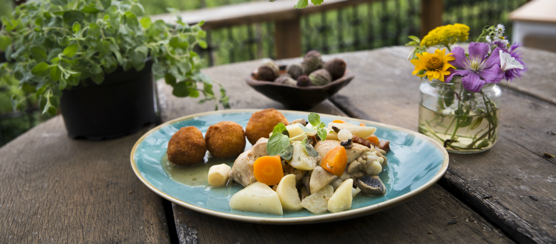 A darabolt csirkecombot és mellet sózzuk, borsozzuk, majd lisztbe forgatva a forró zsírban pirosra sütjük. Kivesszük és a visszamaradt zsiradékban megpirítjuk a kockára vágott szalonnát. A nagyobb szeletekre darabolt zöldségeket a gyöngyhagymával együtt rátesszük a szalonnára. Visszarakjuk az edénybe a pirított csirkedarabokat. Pezsgővel, esetleg kevés vízzel felöntjük és puhára főzzük. A végén friss, vágott majorannával fűszerezzük. A lehűtött főtt rizsből gombócokat formázunk és lisztbe, tojásba, zsemlemorzsába forgatjuk és bő, forró olajban ropogósra sütjük.