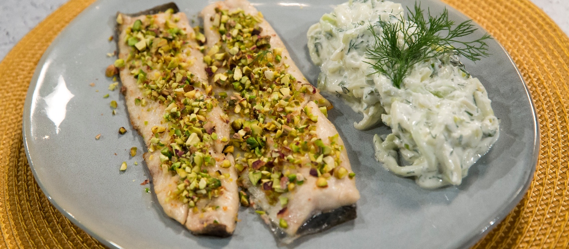 Az őrölt pisztáciát külön megpirítjuk. Összekeverjük sóval, fehérborssal. A pisztráng filét vajban fokhagymával megsütjük, majd megforgatjuk a pisztáciás morzsában.