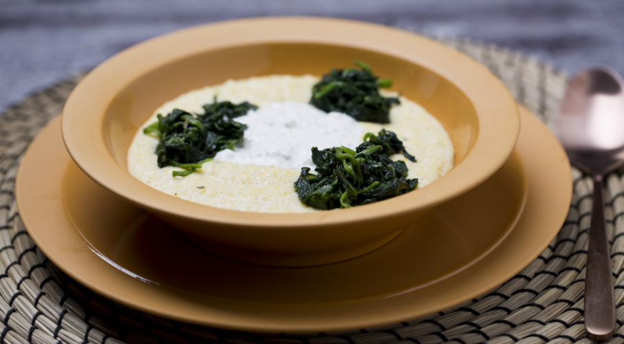 Tejet sóval, kevés vízzel felforralunk. Hozzáadjuk a kukoricadarát, majd folyamatosan kevergetve 15-20 percig főzzük. Hagyjuk lágyra! A spenótot kevés olajon lepirítjuk, sózzuk, zúzott fokhagymával, borssal fűszerezzük és a fűszeres tejfölös túróval leöntött puliszka tetejére tálaljuk.