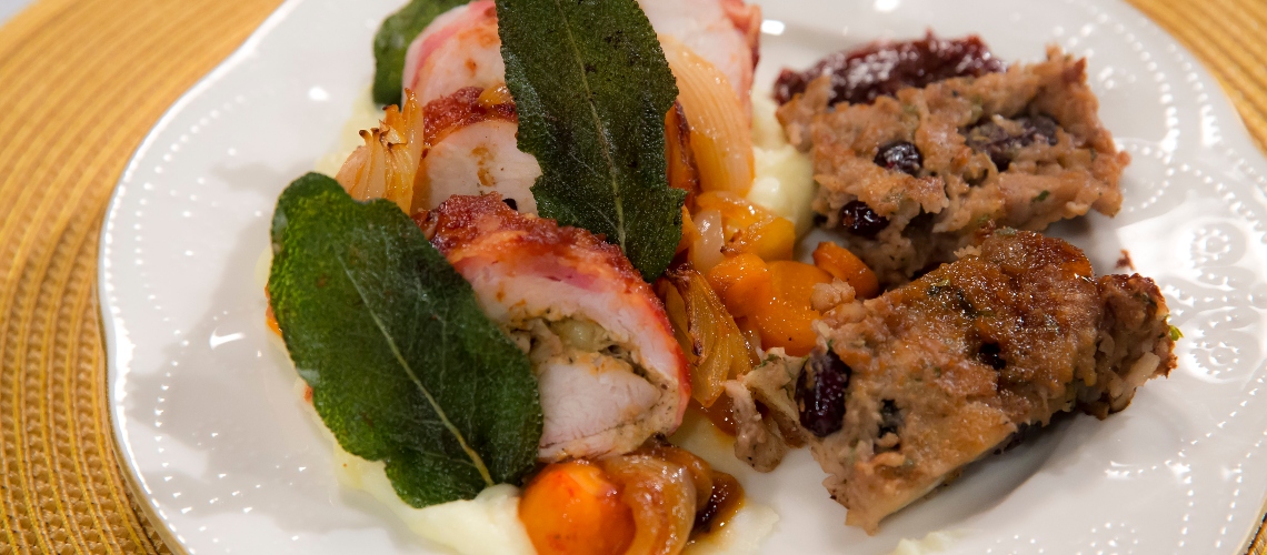 A pulykamellet szeletekre vágjuk, a levágott hártyás részeket félretesszük, és felhasználjuk a töltelékbe. A hús szeleteket fólia alatt kiklopfoljuk.
