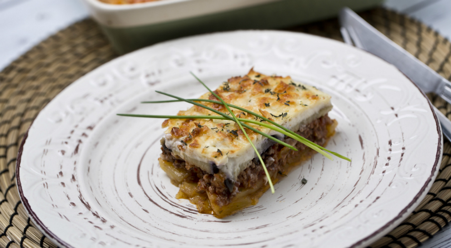 A vékonyra karikázott padlizsánt és burgonyát olajban pirosra sütjük. Finomra vágott vöröshagymán megpirítjuk a bárányhúst, zúzott fokhagymával, őrölt fahéjjal, őrölt borssal, oregánóval, babérlevéllel fűszerezzük. Hozzáadjuk a hámozott, darabolt paradicsomot és alaposan összeforraljuk. Vajból, lisztből, tejből besamel mártást készítünk, sózzuk, borssal és őrölt szerecsendióval fűszerezzük. Egy kivajazott sütőtepsibe lerakjuk a burgonyakarikákat, erre rátesszük a paradicsomos húst, befedjük a padlizsánkarikákkal, majd leöntjük a sűrű besamellel. Sok reszelt sajttal a tetején 180 fokos sütőben 20 perc alatt készre sütjük.