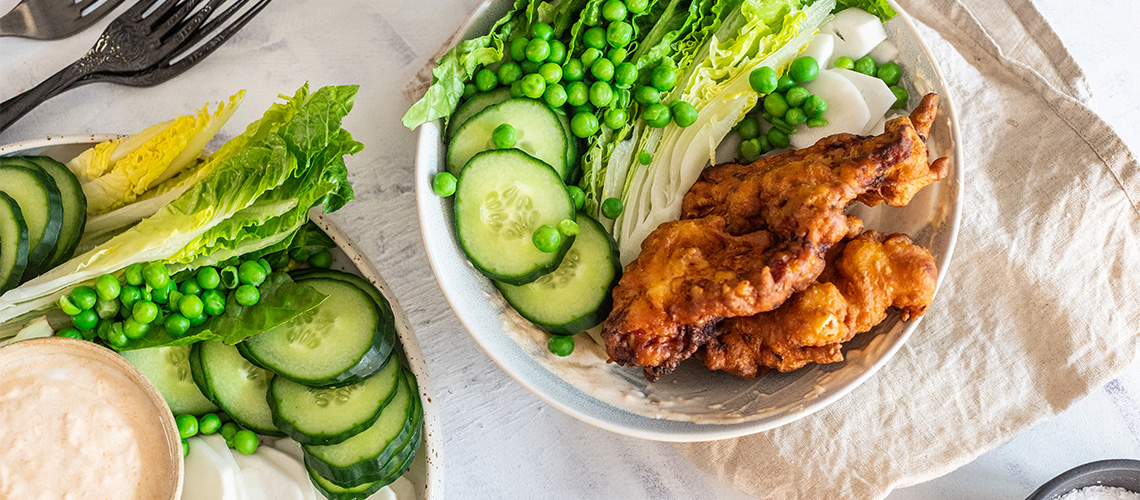 A húsdarabokat a ragacsos masszával együtt egyesével a forró olajba tesszük. Mindkét oldalán kb. négy percig sütjük, amíg aranyszínűre, ropogósra sül. Konyhai papírtörlővel fedett tányéron leitatjuk róla a felesleges olajat. Az összes húst kisebb adagokban ugyanígy kisütjük. Pelyhesített tengeri sóval meghintve tálaljuk.