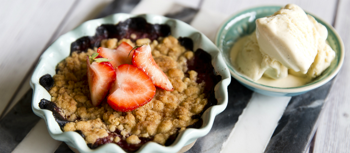 Hámozzuk meg a rebarbarát, és vágjuk nagyobb darabokra. Vajon pirítsuk meg, tegyük kikent sütőtálba. Lisztből, cukorból, fahéjból és vajból morzsa állagú tésztát gyúrunk és a rebarbarára szórjuk. Előmelegített sütőben 180 fokon aranysárgára sütjük. Eperrel és vaníliafagyival tálaljuk.
