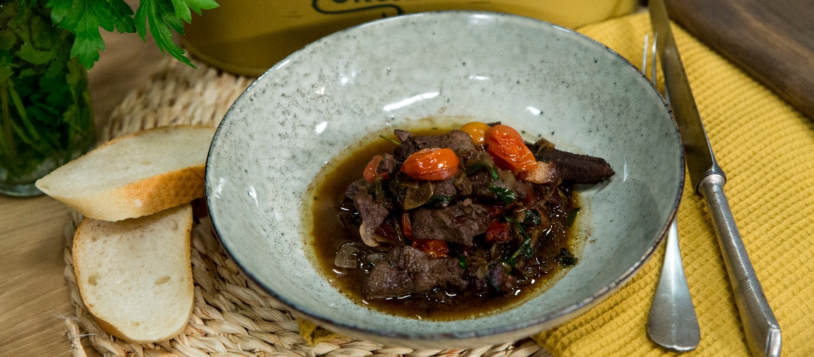Daraboljuk durvára a hagymát és pirítsuk meg. Adjunk hozzá szalonnát, fokhagymát és a megtisztított májat. Sózzuk, borsozzuk, kakukkfűvel ízesítjük. Vörösbort öntünk alá, majd igény szerint alaplével felöntjük. Hozzáadjuk a paradicsomot és vajat, s készre főzzük. Petrezselyemzölddel keverjük be tálalás előtt, majd bagettel vagy pirítóssal tálaljuk.