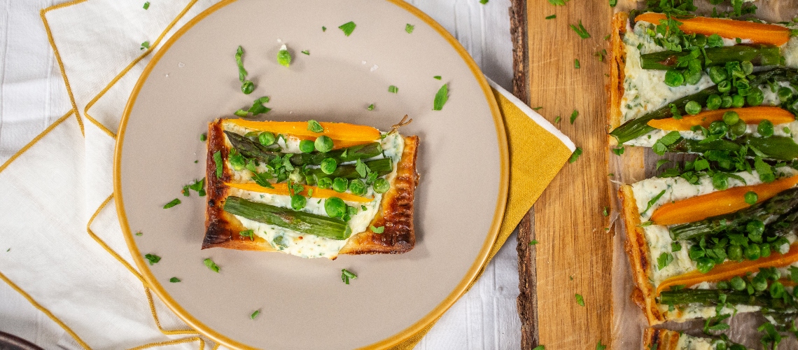 A ricottát és a mascarponét keverőtálba tesszük. Hozzáadjuk a reszelt parmezánt, a zöldfűszereket és a citrom reszelt héját. Sózzuk, borsozzuk, összekeverjük. A krémet kettéosztjuk és a kihűlt, elősütött tésztára kenjük. Elrendezzük rajta az előfőzött zöldségeket, sózzuk, borsozzuk, meglocsoljuk olívaolajjal és reszelünk rá egy kevés parmezánt. Visszatesszük a sütőbe és 20 perc alatt készre sütjük.