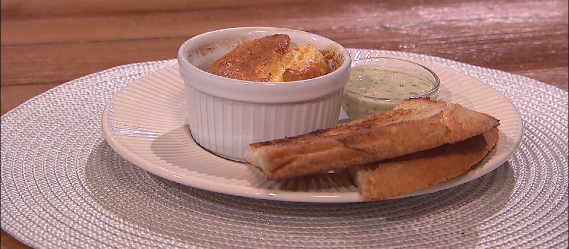 4 db szufléformát kivajazunk és megszórunk reszelt parmezán sajttal. A formák peremén 1 cm vastagságban végighúzzuk az ujjunkat. Az előkészített formákat a hűtőbe tesszük.