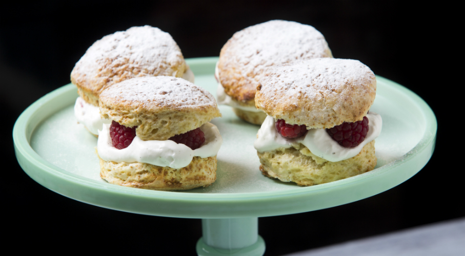 A száraz hozzávalókat egy tálba összeszitáljuk, majd beleöntjük a tejet és a vajjal összegyúrjuk. Gyors mozdulatokkal gyúrjuk, nem kell kidolgozni, csak álljon össze. Ezután 3-4 cm vastagra nyújtjuk és 6-8 cm ámérőjű szaggatóval kis pogácsákat szaggatunk a tésztából. Ezeket egy tepsibe, szorosan egymás mellé tesszük, így majd felfelé nőnek. Tojással lekenjük a tetejüket és 220 fokos sütőben 10-14 percig sütjük. Amikor kihűltek kettévágjuk és megtöltjük vaníliás tejszínhabbal és friss gyümölcsökkel.