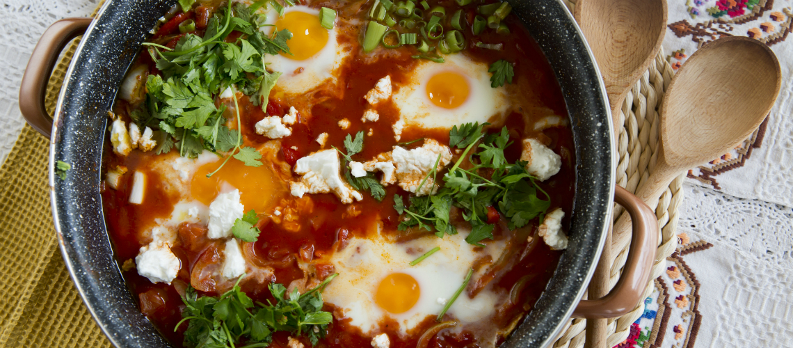 Egy nagy serpenyőben, olívaolajon üvegesre dinszteljük a finomra aprított hagymát és fokhagymát, amikor kezdenek puhulni, hozzáadjuk a fűszereket: a koriandert, római köményt, fahéjat, pirospaprikát, cayenne borsot. Beletesszük a darabokra aprított zöldpaprikát, és azt is puhára pároljuk. Hozzáadjuk a paradicsomkonzervet és a friss, cikkekre vágott paradicsomot. Ezután kb. 15 percig főzzük erős lángon, hogy a mártás kissé besűrűsödjön, de azért maradjon leve, majd hozzáadjuk a finomra aprított petrezselymet és a nádcukrot. Sóval, borssal ízesítjük. Négy mélyedést formázunk a lecsóban, beleütünk egy-egy tojást, majd lefedve kb. 10 percig főzzük, hogy a tojás fehérje megdermedjen, a tojássárgája viszont folyós maradjon. Tálaláskor friss snidlinget, koriandert szórunk rá, és reszelhetünk rá sajtot, fetát is. Friss kenyérrel, vagy pitával kínáljuk.