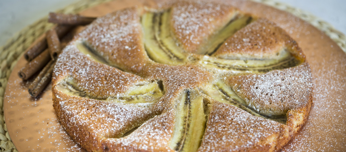 Vajazott, lisztezett / sütőpapíros formába töltjük. A 4 banánt lisztbe forgatjuk, félbevágjuk és vízszintesen kettévágjuk. A 8 db negyed banánt a tészta tetejére helyezzük és citromlével megkenjük.