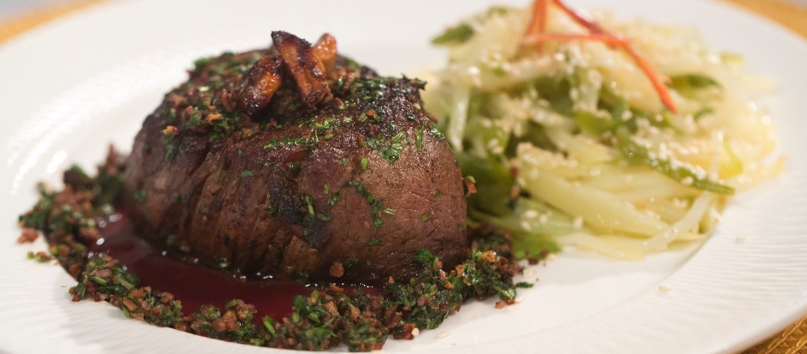 A húst tálalás előtt kevés olajon megsütjük. A serpenyőbe teszünk fokhagymát és egy rozmaring szárat is. Mikor már majdnem kész vajat teszünk mellé és még párszor meglocsoljuk vele. Amikor kivesszük a húst és még szaftos, megforgatjuk a zöldfűszeres baconos morzsában.