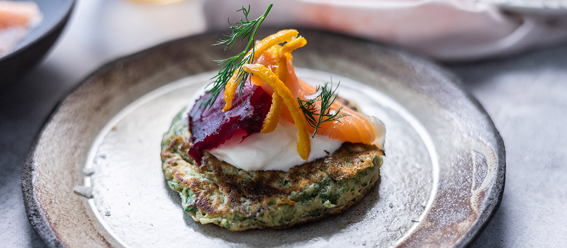 A tejfölt elkeverjük a reszelt narancshéjjal. Minden palacsintára teszünk egy kiskanál tejfölt, 1-2 szelet céklát, lazacot és kevés citromot vagy narancsot. Megszórjuk finomra aprított zöldfűszerrel és előételként kínáljuk.