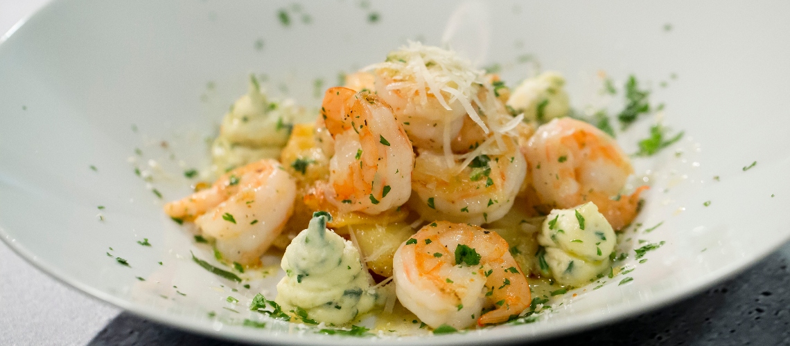 Sült garnéla spenótos krumplipürével, gratennel