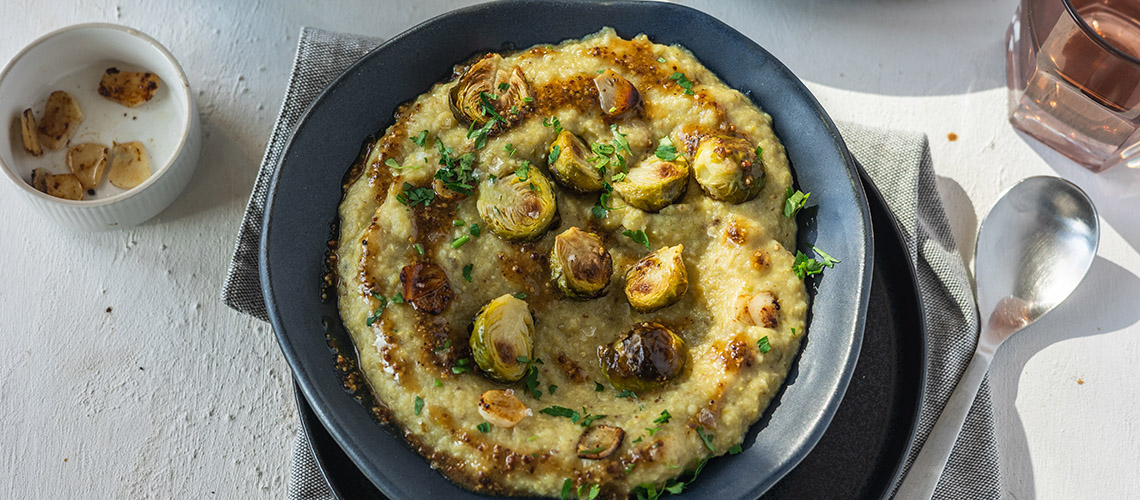A kelbimbókat félbevágjuk, és a fokhagymagerezdekkel együtt rátesszük egy sütőpapírral bélelt tepsire. 180 fokra előmelegített sütőben 20−25 perc alatt aranyszínűre sütjük. Közben a hagymát vékony szeletekre vágjuk, és kevés olajon párolni kezdjük, a burgonyát pedig kockára vágva puhára főzzük. A megsült kelbimbó harmadát félretesszük, kétharmadát a finoman megpirított hagymához adjuk és magos mustárral ízesítjük. Felöntjük a zöldségalaplével, sózzuk, borsozzuk, és pár percig rotyogtatjuk az egészet, míg teljesen megpuhul. A főtt burgonyát is a kelbimbóhoz adjuk, és egy botmixer segítségével az egészet szép krémesre pürésítjük. Végül hozzákeverjük a hideg vajat. Igény szerint további zöldségalaplével állítjuk be a megfelelő állagot.