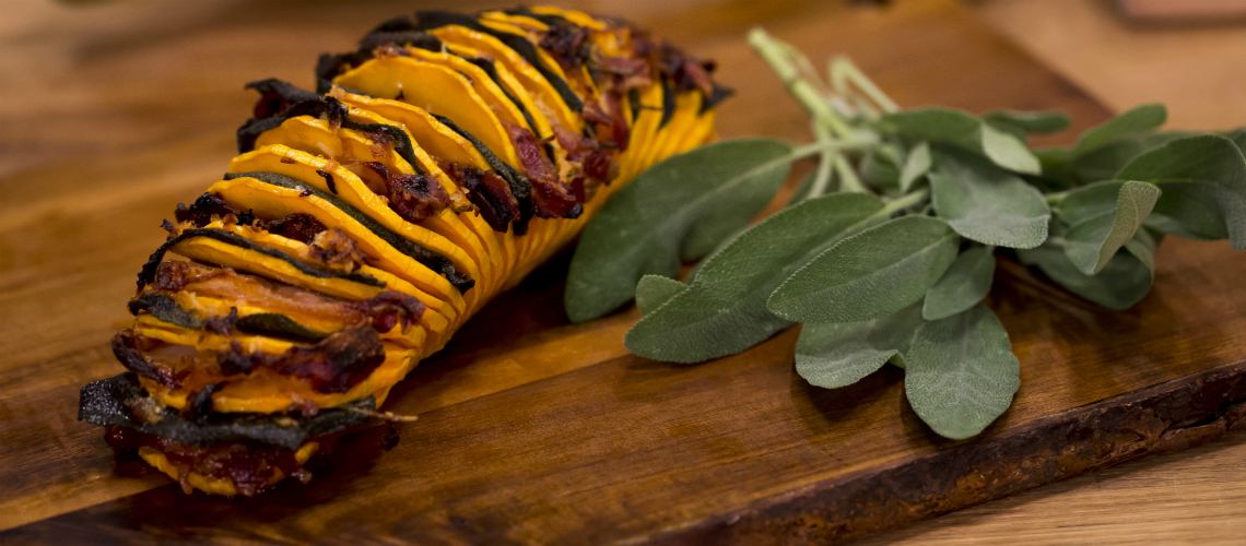 A sütőtököt meghámozzuk, 180 fokra előmelegített sütőben 15 percig sütjük, hogy kissé megpuhuljon. Kivesszük a sütőből és 2 miliméterenként bevagdossuk, vigyázva, hogy ne vágjuk teljesen át.A töknek megfelelő méretű hőálló edénybe tesszük, megtűzdeljük baconnel és zsályával.