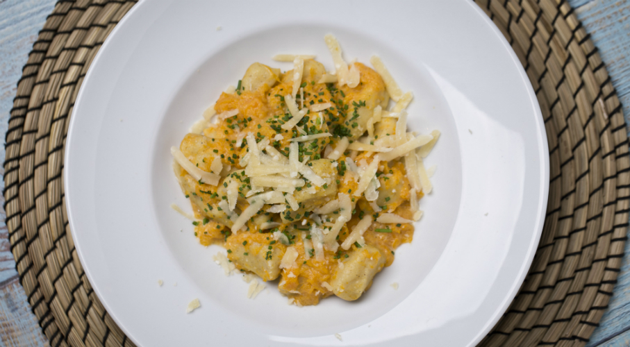 A főtt, áttört, lehűtött burgonyát alaposan összedolgozzuk az egész tojással, egy tojás sárgájával és a liszttel. Sózzuk, borssal, szerecsendióval fűszerezzük. Rudakat formázunk a tésztából, feldaraboljuk, majd sós vízben néhány perc alatt kifőzzük. A sült sütőtököt a héjából kivéve olívaolajon megpirítjuk, alaplével felöntjük, sózzuk, borsozzuk. Tejszínnel dúsítjuk és ebbe a mártásba forgatjuk a kész gnocchit. Tálalhatjuk rukkolával, friss parmezánnal.