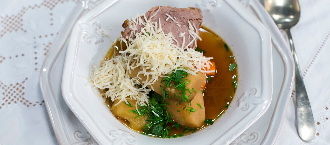 A marhahúst forrásban levő alaplébe tesszük, majd bezöldségezzük. Mintegy két órát, megpuhulásig főzzük. Zöldségekkel és reszelt tormával tálaljuk.