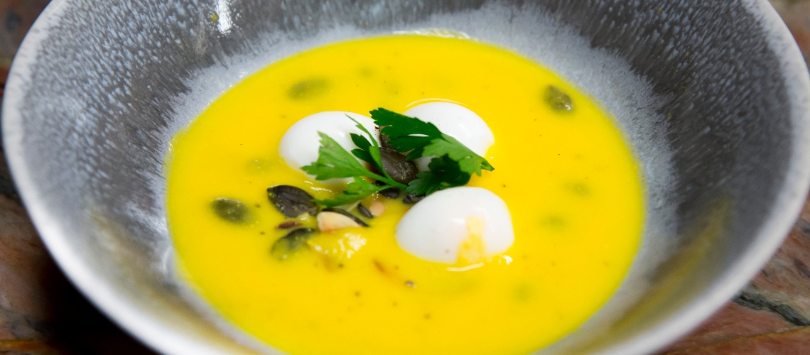 Az apróra vágott vöröshagymát a fokhagymával olajon lepirítjuk, majd hozzá adjuk a feldarabolt gyökér zöldségeket, ezeket is lepirítjuk kicsit, hogy kijöjjön az ízük, majd vízzel felöntjük a levest. Ha félig megfőttek, hozzáadjuk a felaprított karfiolt is. Ha készre főtt, turmix géppel pürésítjük, majd szitán is átpasszírozzuk, hogy selymesebb legyen. Beletesszük a cukorborsót. Tovább főzzük, majd hozzáadjuk a tejszínt, ami lehet laktózmentes is! Felforraljuk. Ízlésünknek megfelelő mennyiségű citrommal savanyítjuk, sózzuk, borsozzuk. A fürjtojásokat kilenc perc alatt keményre főzzük, megpucoljuk, és 2-3 darabot a levesbe helyezünk. A magvakat száraz serpenyőben megpirítjuk, a levesre szórjuk.