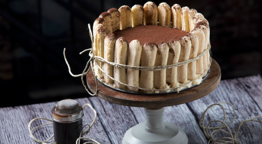 Ungem cu unt şi dăm cu făină o formă de tort de 20 cm în diametru. Pentru blatul de tort, încălzim într-o oală unt şi lapte, până când se topeşte untul, apoi lăsăm să se răcească un pic. Amestecăm făina cu praful de copt. Amestecăm ouăle cu zahărul până când obţinem o cremă albă, pe urmă, adăugăm untul topit şi laptele, apoi, şi amestecul de făină. Turnăm aluatul în forma pregătită şi-l coacem timp de 40-45 de minute, în cuptorul preîncălzit la 175 de grade. Verificăm aluatul prin împungere şi, dacă acesta nu se lipeşte de cuţit, putem să-l scoatem din cuptor. Îl lăsăm să se răcească, îl scoatem din formă şi împărţim blatul în patru felii. Pentru siropul de cafea, fierbem într-un vas cafeaua cu zahărul. Adăugăm whisky-ul doar când zahărul s-a topit, ca să nu se evapore alcoolul. Lăsăm amestecul să se răcească. Pentru cremă, amestecăm cu zahăr cele patru gălbenuşuri, deasupra unei băi de aburi, până când devine o cremă albă. Când începe să se îngroaşe, luăm crema de pe foc şi o lăsăm să se răcească. Când s-a răcit, adăugăm brânza mascarpone şi extractul de vanilie, apoi o lăsăm la răcit. Batem cu robotul frişca, până devine tare. O amestecăm uşor cu crema de mascarpone, apoi o răcim iar. Aşezăm primul blat pe fundul unei forme de tort de 24 cm în diametru. Îl înconjurăm cu pişcoturi de şampanie. Stropim blatul cu sirop de cafea, apoi îl ungem cu un sfert din crema de mascarpone. Aşezăm la rând blaturile cu sirop de cafea şi crema de mascarpone. Punem cremă şi deasupra tortului. Înainte de feliere, lăsăm tortul în frigider cel puţin patru ore sau toată noaptea, apoi îl decorăm cu cacao şi ciocolată rasă.
