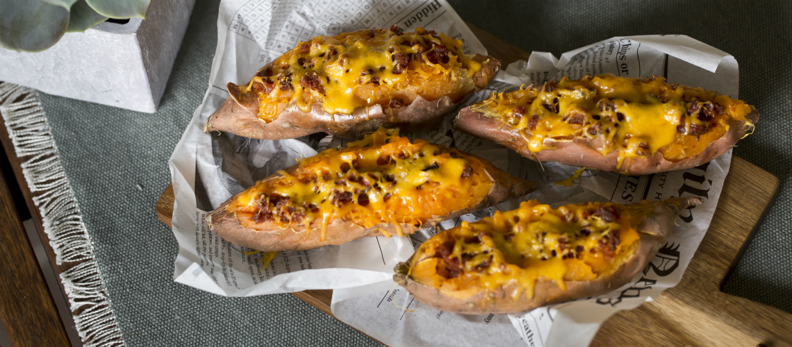 Közben a kibelezett édeskrumplikat meglocsoljuk olívaolajjal és 1o percre visszatoljuk a sütőbe. Az újrasütött krumplikat megtöltjük a töltelékkel, megszórjuk reszelt sajttal és ropogósra sütjük a sütőben.