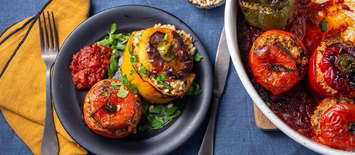 A paprikák belsejét sózzuk, borsozzuk és megszórjuk egy kevés cukorral. A tölteléket mindegyikben kb. ⅔ részig töltjük és rárakjuk a tetejüket. Az egészet meglocsoljuk olívaolajjal és sózzuk, borsozzuk. 180 fokra előmelegített sütőben 1 óra alatt készre sütjük. Tálaláskor meglocsoljuk a szaftjával, kevés olívaolajjal és megszórjuk aprított petrezselyemmel.