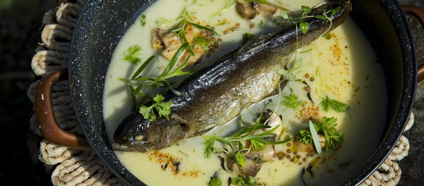 A pisztrángot megtisztítjuk, megsózzuk és friss fenyőhajtásokat teszünk bele, majd serpenyőben kis lángon kisütjük. A csontokból alaplét készítünk, amit redukálunk és vajjal besűrítünk, majd friss gombát szeletelünk bele. A halat erdei fűszernövényekkel és eperolajjal tálaljuk.