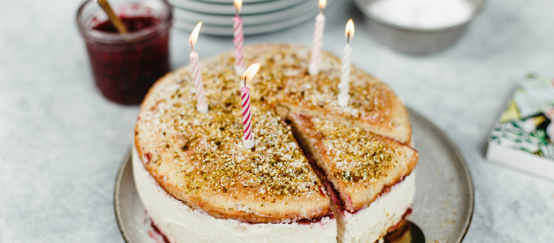A sütőt 180 fokra előmelegítjük. 2 db 22 cm-es kapcsos formát kivajazunk és kilisztezünk. A finomra őrölt pisztáciát összekeverjük a liszttel és egy csipet sóval.