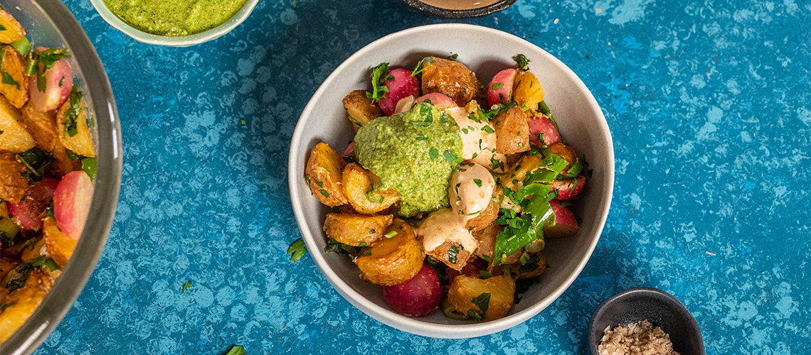 A retek gumókat megtisztítjuk, félbevágjuk. Egy serpenyőben felhevítjük a vajat és a maradék 1 evőkanál olajat. A retkeket magas lángon időnként megkeverve megpirítjuk, majd átöntjük egy nagy salátás tálba. Hozzászórjuk a megsült újkrumplikat, újhagymát és petrezselymet, majd az öntettel együtt összekeverjük. Kanalazunk rá a pesztóból és sóval meghintve kínáljuk.