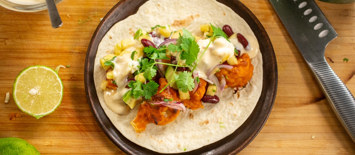 A taco összeállításához egy puha tortillába teszünk sült karfiolt, édesburgonyát, pár szelet avokádót, egy evőkanál babkonzevret vagy főtt babot és ananász salsát.